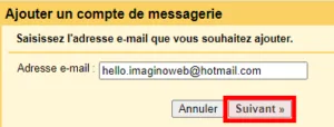 - Une fenêtre s’est ouverte, entrez votre adresse mail (de votre nom de domaine, Outlook, Hotmail, Live, Yahoo, Orange, Neuf…) à ajouter à Gmail et cliquez sur Suivant