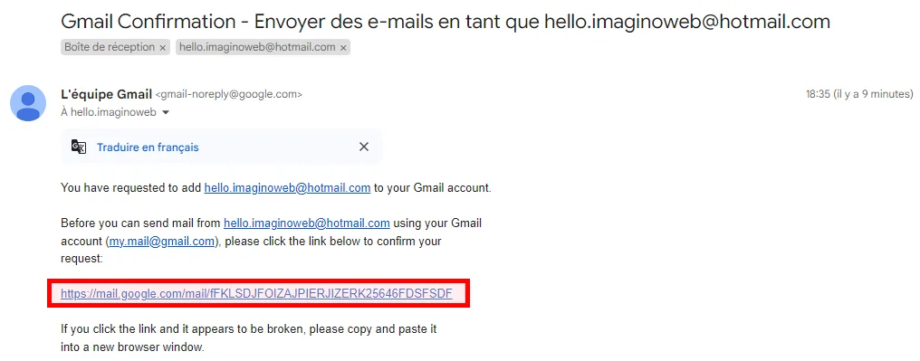 - Une fois ajouté, vous allez recevoir un mail de la part de l’équipe Gmail sur votre Gmail, cliquez dessus puis sur le lien à l’intérieur du mail