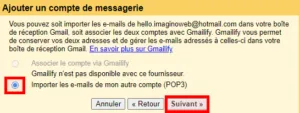 - Cliquez sur Importer les e-mails de mon autre compte (POP3) et cliquez sur Suivant