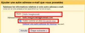 - Remplissez le nom qui apparaitra sur vos futurs e-mail, assurez-vous que l’option Traiter comme un alias est bien cochée et cliquez sur Étape suivante